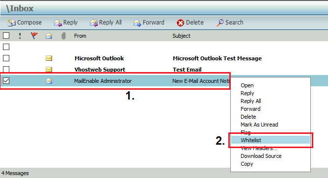 2. ใน โฟลเดอร์ Junk-Mail ให้เราเลือกอีเมล์ฉบับที่มีชื่อผู้ส่ง แล้ว ทำการ คลิ๊กขวา แล้วเลือกไปที่ Whitelist ดังในภาพ